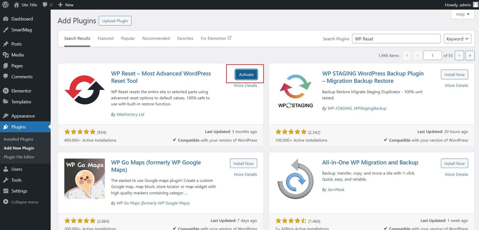 - Click the Install Now button next to WP Reset, and then click Activate.