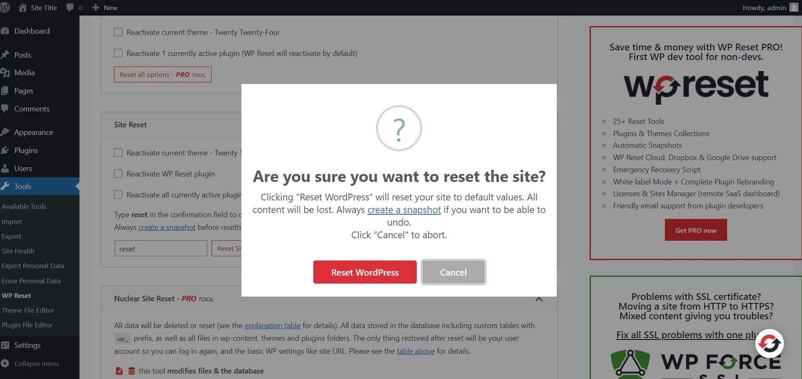 - In the WordPress dashboard, go to Tools → WP Reset.